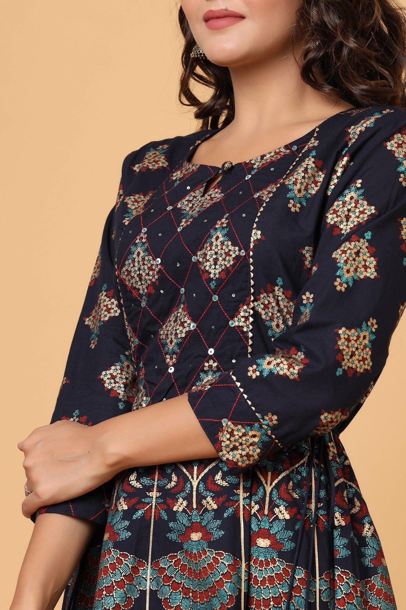 Blue Gold Printed Cotton Ethnic Gown By KAAJH. It Has Elegant Embroidery Work On Neck Line Which Makes This Gown A Classy And Fabulous. You Can Pick This Gown For Your Casual Gatherings and Events. This Gown Is Crafted of 100% Pure Cotton.